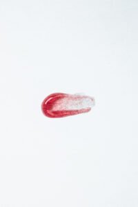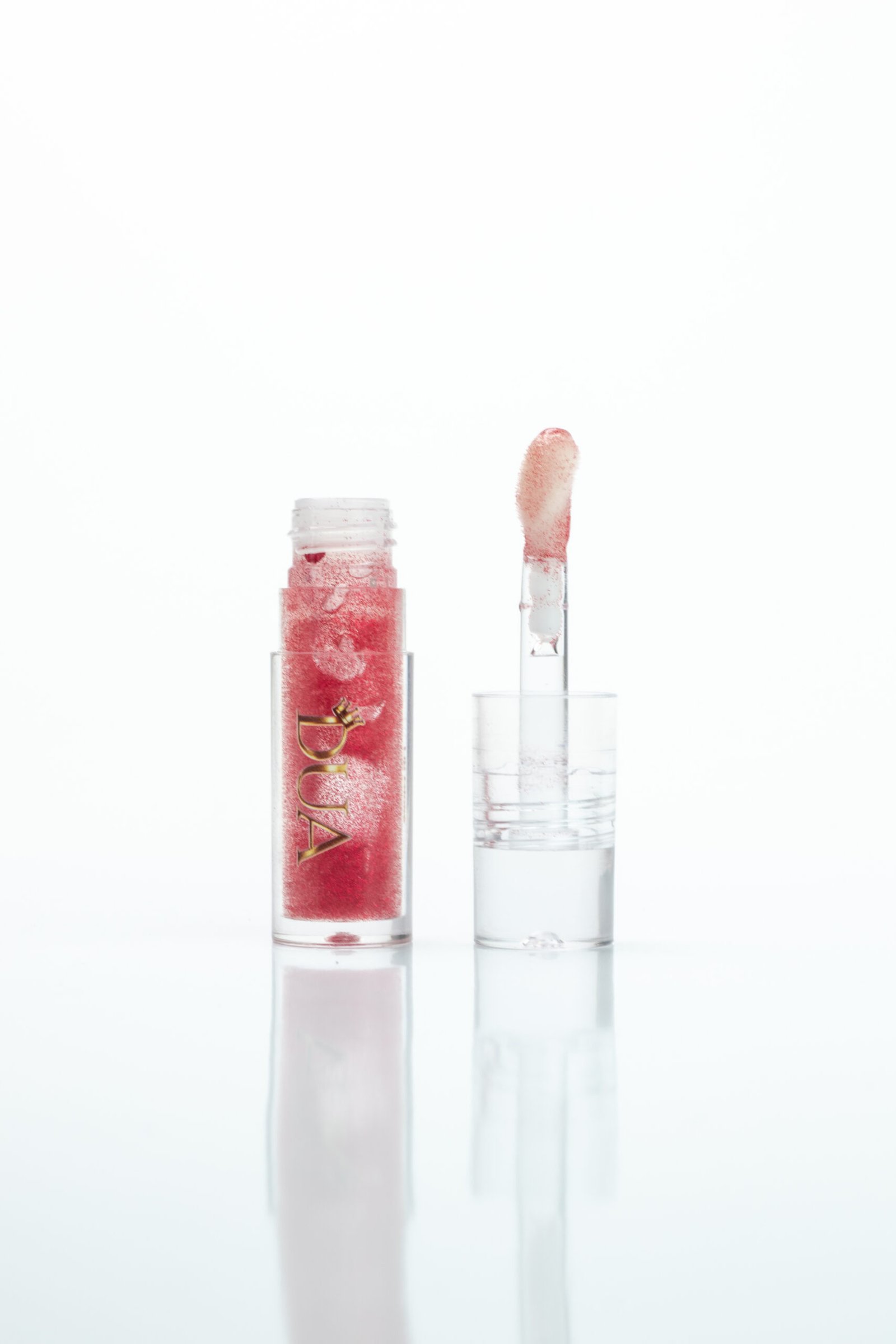 A transparent red glitter lip gloss that delivers a juicy, playful shine