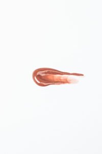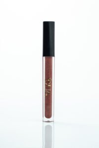 A light brown lip gloss with subtle silver glitter for a warm, elegant glow.