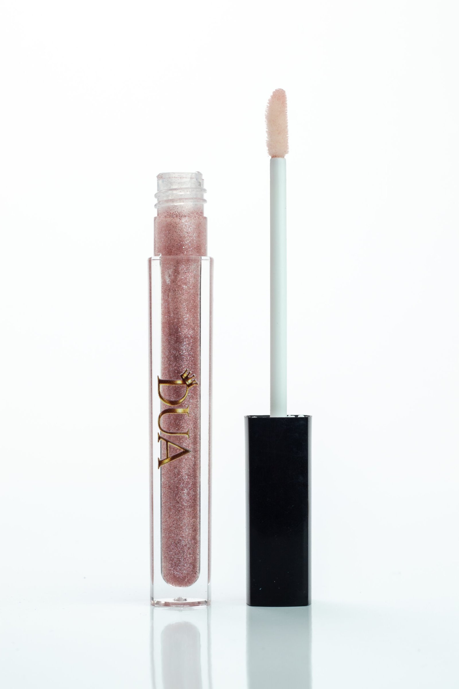 A transparent rose glitter lip gloss that adds a soft rosy sparkle.